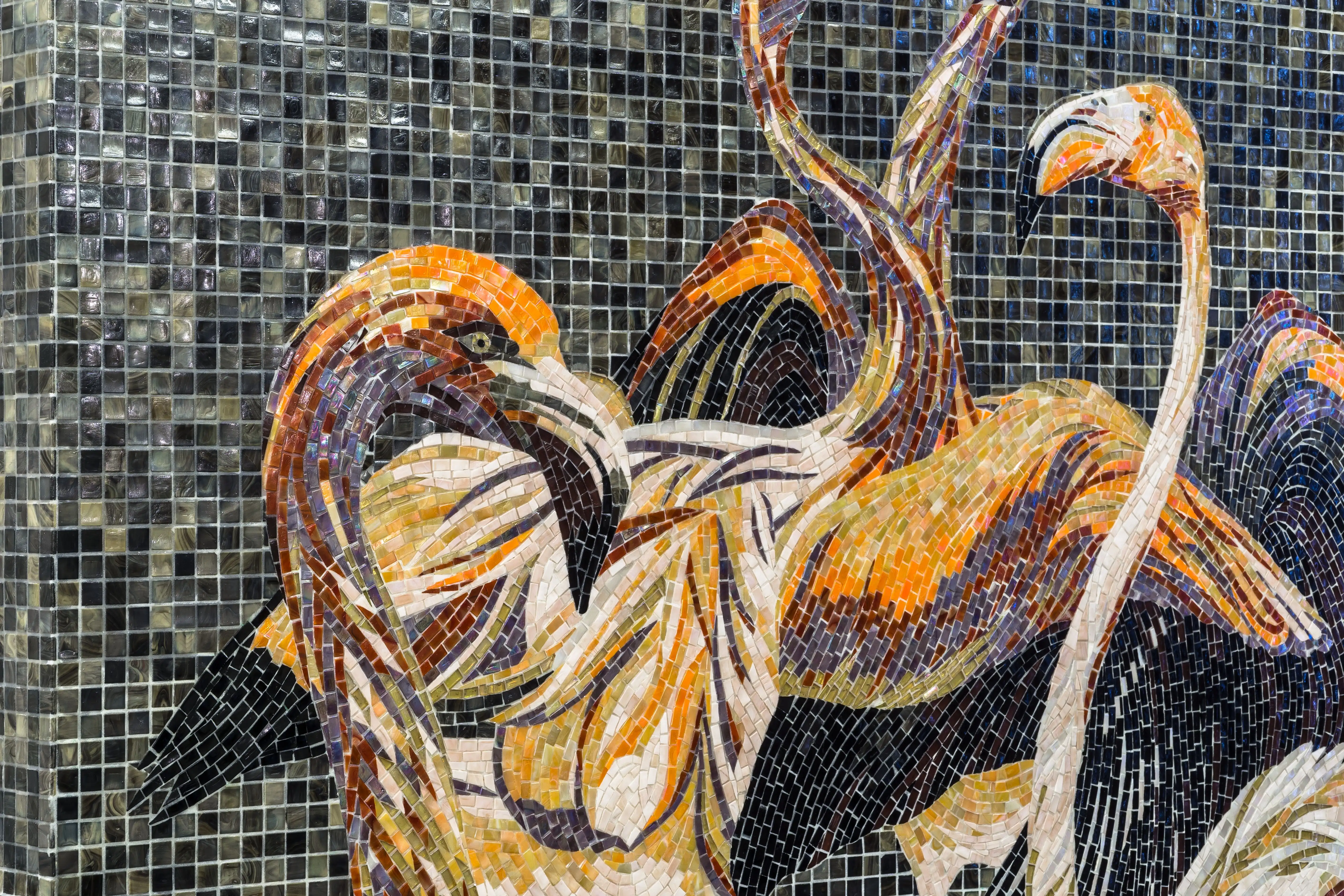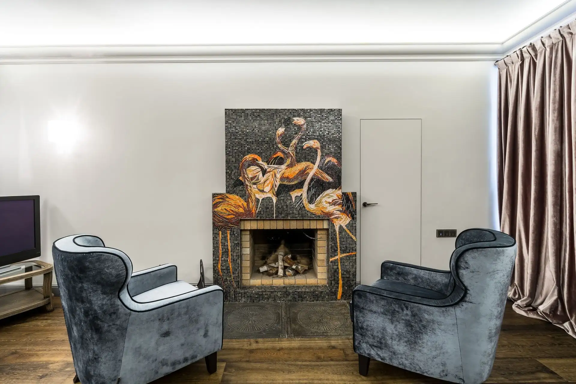 Камин в этом проекте гостиной стал настоящим сердцем всего дома. Не только потому, что дарит тепло, но и прежде всего за счет своего декора – мозаичного панно с изображением фламинго, выполненного в художественной технике. Стеклянная мозаика прекрасно подходит для отделки каминов: она не боится высоких температур и проста в уходе.